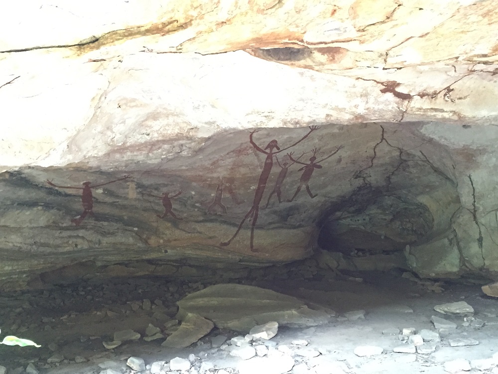 This cave is thought to have been used as a sacred site for initiation ceremonies, with faint hand stencils of boys found in the cave. The low tunnel seen on the bottom right leads about 13 metres to another cave which was also used for initiation ceremonies.